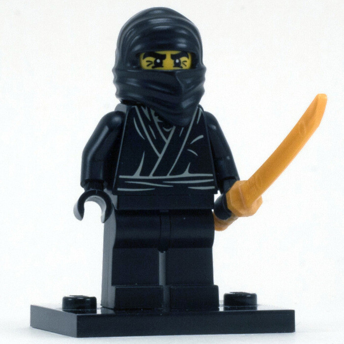 LEGO 8683 Series 1 from 2010 Collectible Minifigure Ninja with two golden katanas. Each collectible minifigure is brand new factory sealed in its original mint condition foil pack complete with accessories, display plate, and collector's leaflet.